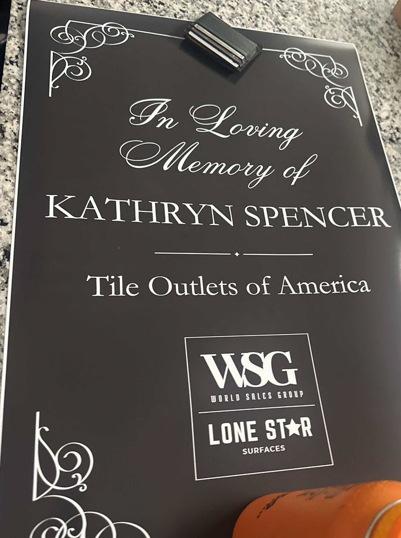 The flooring industry recently lost not just a professional of the highest caliber, but a beloved colleague and friend, according to World Sales Group. Kathryn “Kate” Spencer, a longtime partner and supporter of Tile Outlets of America, passed away this year, leaving behind a legacy defined by dedication, grace and an unwavering commitment to excellence, the company stated.
